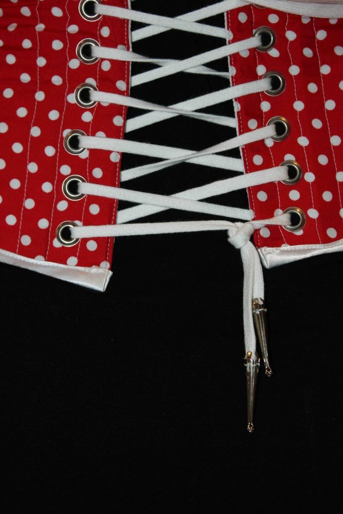Ce serre-taille est tout simple : taffetas, biais noir sur lequel j’ai collé quelques strass rouge. Rien à en dire de plus 🤭 … hormis le fait que le laçage est bien trop court et que je n’aime vraiment pas ce genre de cordon. A refaire donc avec un ruban noir et un serrage plus…