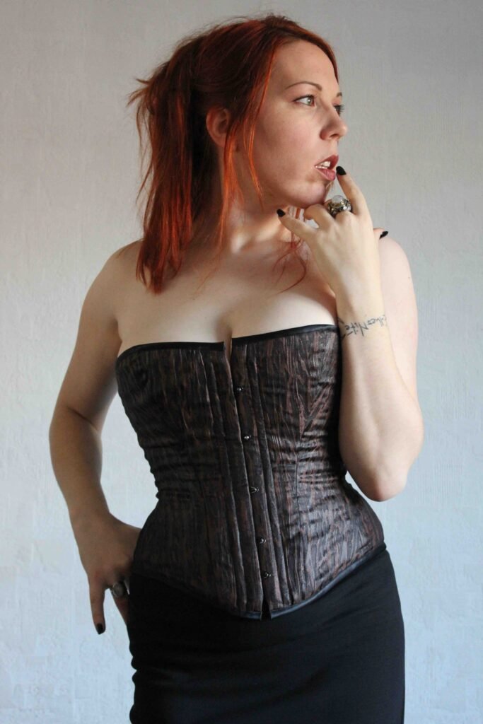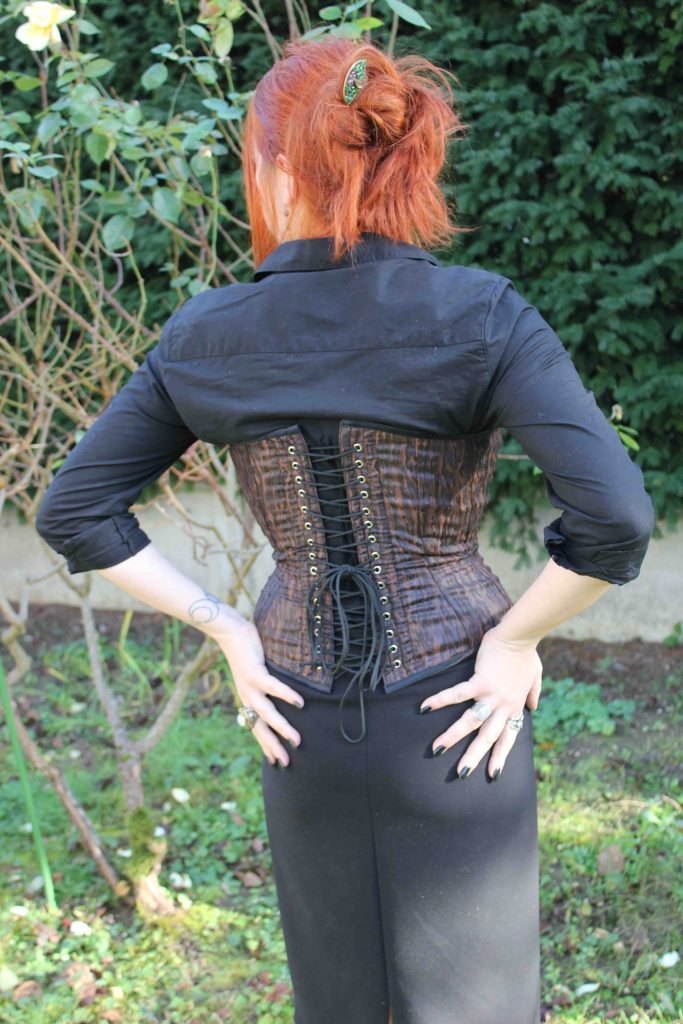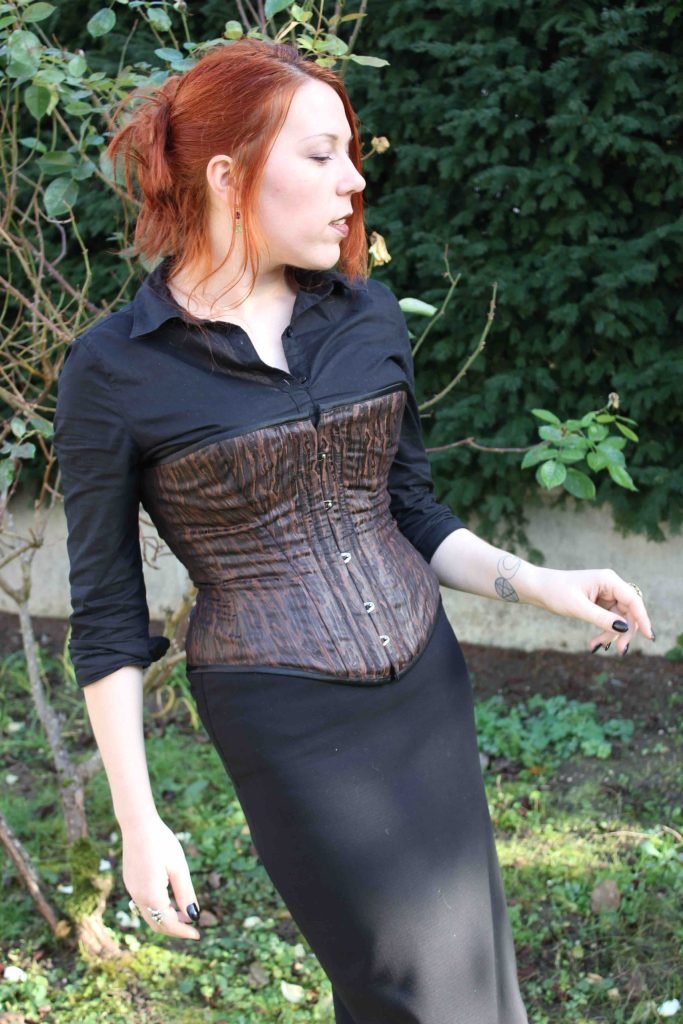J’avais repéré ce tissu chez Mondial Tissus. Il m’a immédiatement fait penser à l’écorce et je le voyais déjà en corset. Seul bémol : sa texture. Légèrement « froissé » et fin, je me demandais si le rendu serait bon, avec toutes les lignes de coutures nécessaires aux casiers des baleines. Et bien ce fut, je dois le dire, une belle surprise !