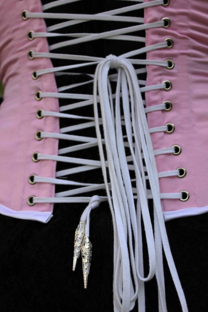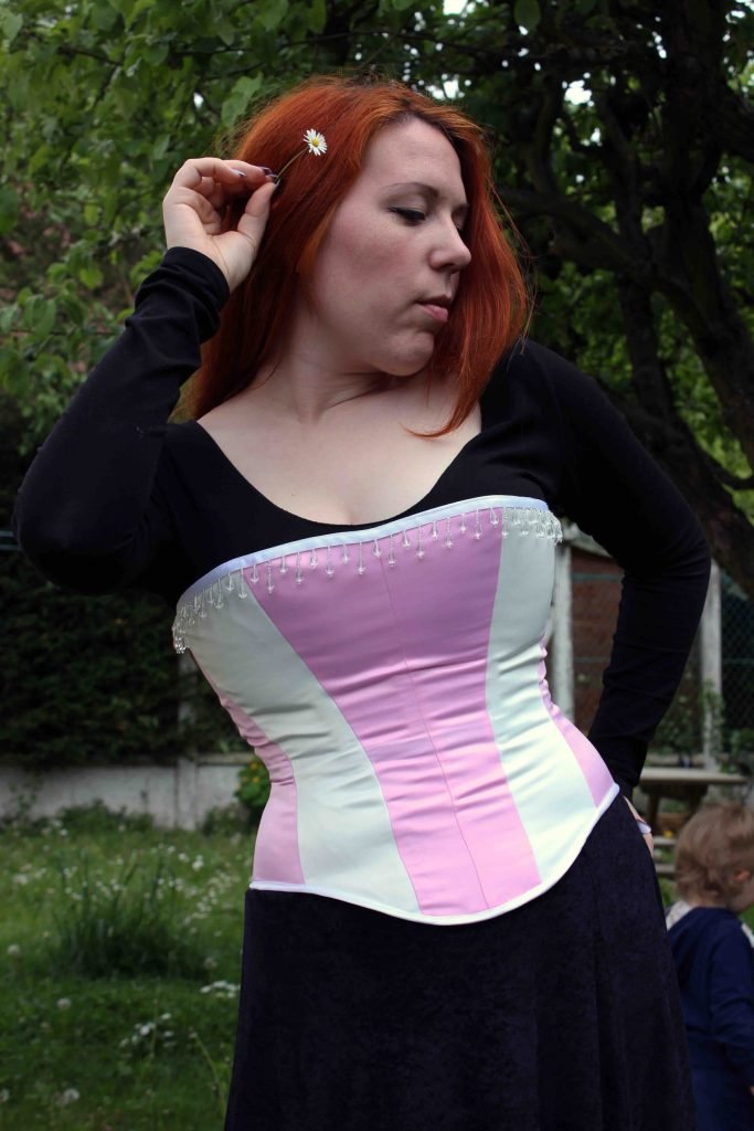 Je voulais faire un corset doux et utiliser du rose. Dans mon esprit, je cherchais quelque chose de « pur » et je suis tombée sur ce ruban à gouttes. Immédiatement, j’ai su ce que j’allais faire, et voici le résultat !