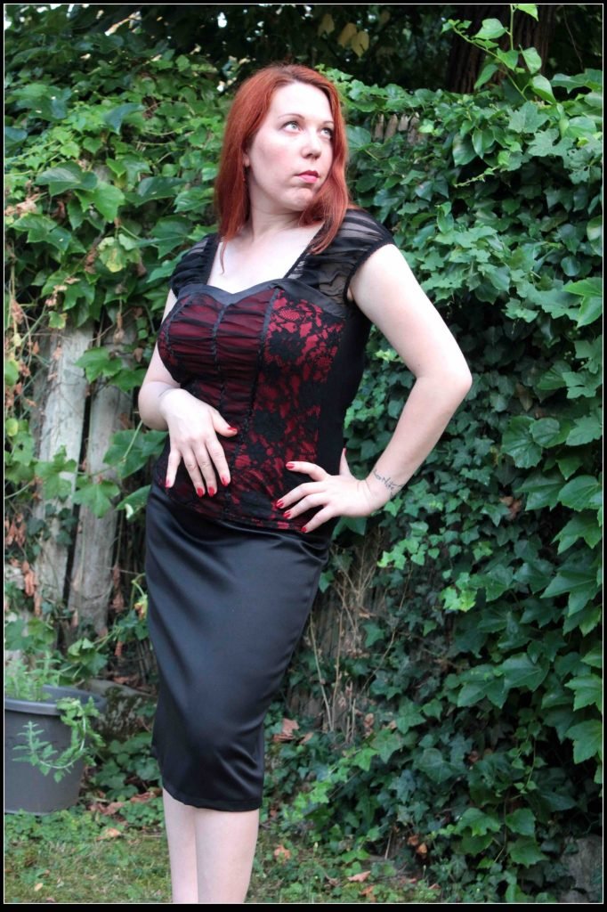 Ce serre-taille est tout simple : taffetas, biais noir sur lequel j’ai collé quelques strass rouge. Rien à en dire de plus 🤭 … hormis le fait que le laçage est bien trop court et que je n’aime vraiment pas ce genre de cordon. A refaire donc avec un ruban noir et un serrage plus…