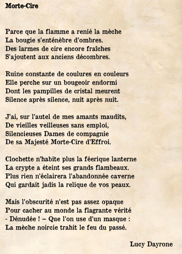 Retrouvez dans ce recueil les lambeaux d’une époque torturée. Gardien de secrets, du Crèvecoeur au velours des promesses, laissez-vous guider entre ces pages par sa Majesté Morte-Cire d’Effroi.