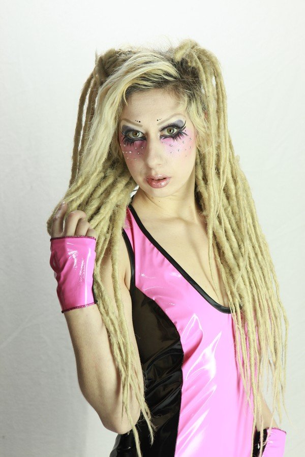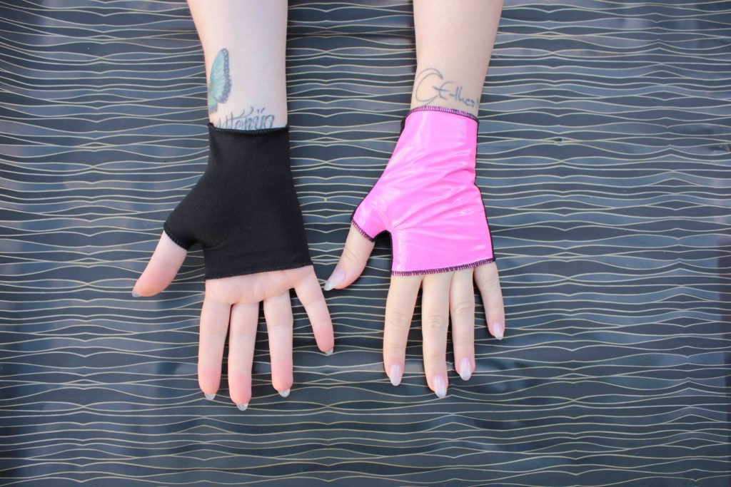 MAJ 02/2013 : j’ai tenté une version de la Capture en vinyle, accessoirisée de mitaines. Hélas, le vinyle est un tissu terriblement fragile pour ce genre de robe. Elle a d’ailleurs été abimée durant le shooting. Je n’en ai pas fabriqué d’autres en vinyle, depuis.
